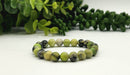 Kaunis serpentiinistä valmistettu 8 mm helmistä koottu joustava rannekoru. Rannekoru on noin 19 cm pitkä ja sopii useimpiin ranteisiin. Korussa on käytetty luonnollisia puolijalokiviä ja se on kaksoisnyöritetty kestävyyden parantamiseksi.