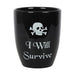 Dieser Keramiktopf verfügt über einen humorvollen Text „Ich werde überleben“, der durch ein Totenkopf-Design akzentuiert wird. Dadurch ist der Topf ein perfektes Zuhause für lebende und tote Pflanzen.