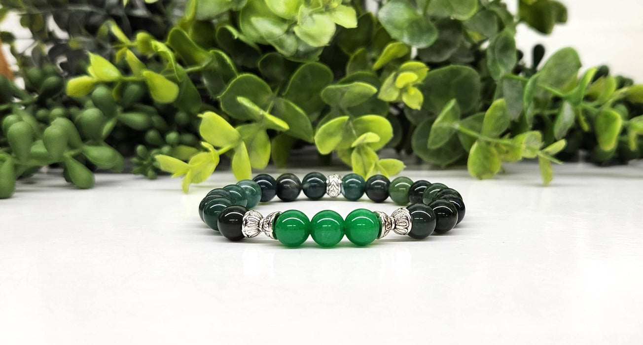 Tämä n. 19 cm  pitkä rannekoru on valmistettu aidosta vihreästä jadesta (keskikivi) ja sammalakaatista, jotka tunnetaan perinteisesti runsautta, kasvua ja vaurautta edistävinä kivinä.