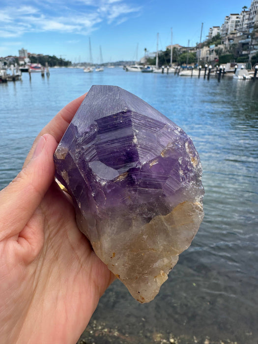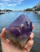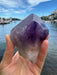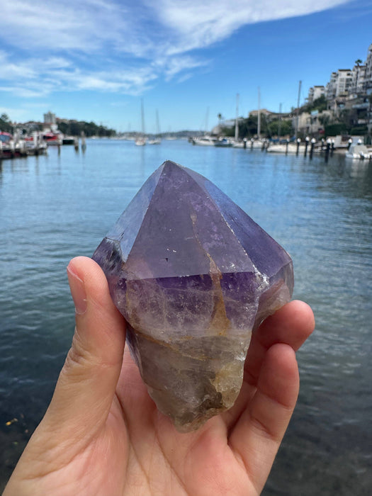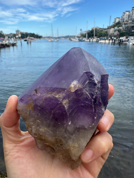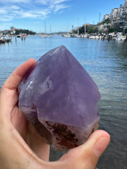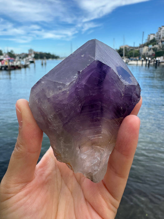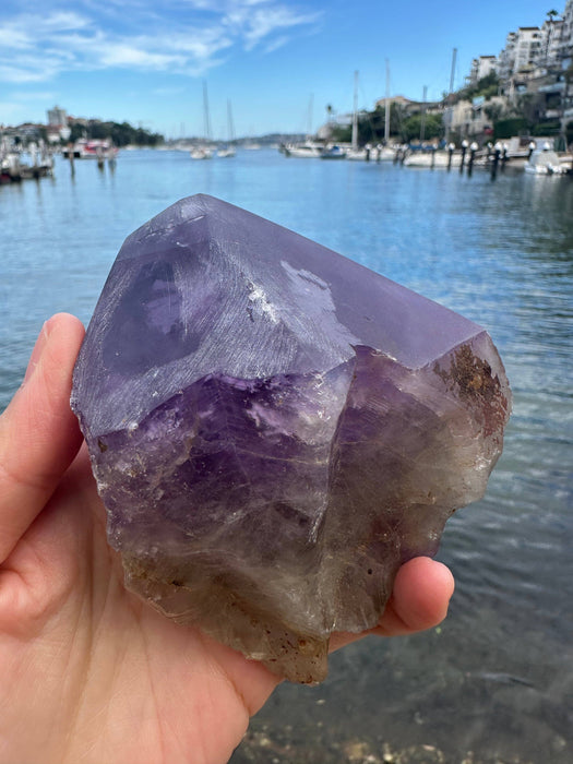 Tämä näyttävä, luonnollinen ametistikärki on peräisin Brasiliasta ja esittelee ametistin syvän violetit sävyt ja luonnon muovaaman rakenteen parhaimmillaan. Jokainen yksilö on ainutlaatuinen, ja pinnassa voi esiintyä sekä kiiltäviä että hieman rouheampia kohtia – juuri niin kuin luonnonvoimat ovat sen muovanneet.