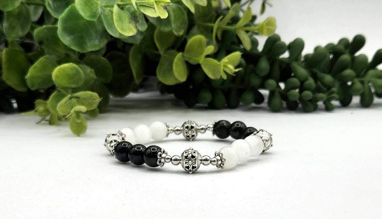 Kaunis joustava rannekoru, joka on valmistettu 8 mm kokoisista seleniitti- ja shungiittikivistä sekä hopeanvärisistä metallikoristeista. Korun teemana on suojelu, ja se sopii hyvin lahjaksi henkilölle, joka kaipaa muistutusta siitä, että parempia päiviä on tulossa.