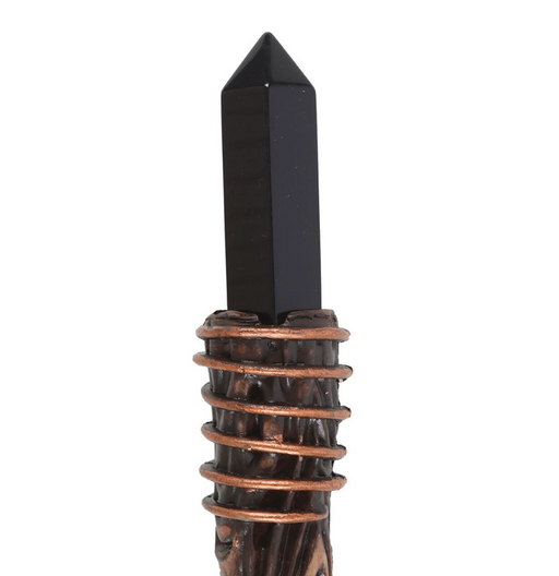 Taropuoti MagickBaguette magique en plastique avec pentagramme, serpent, patte d'oiseau et "pierre" bleue.