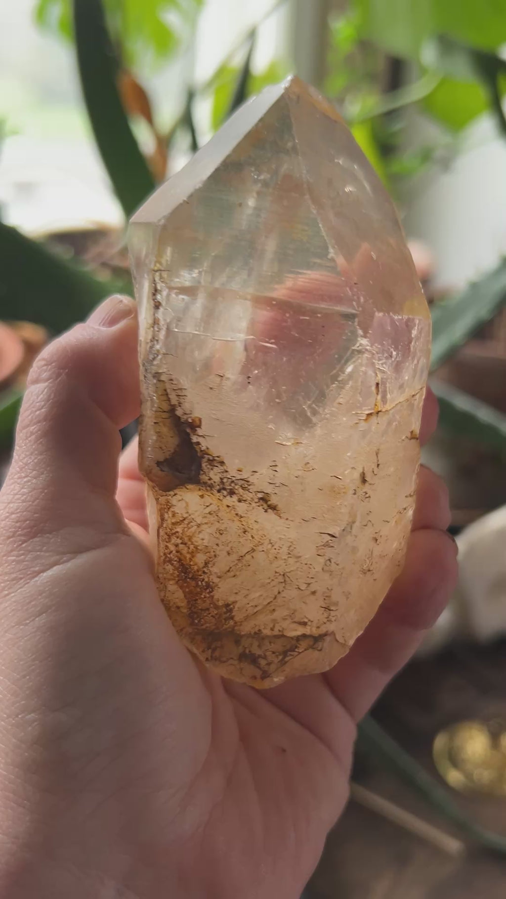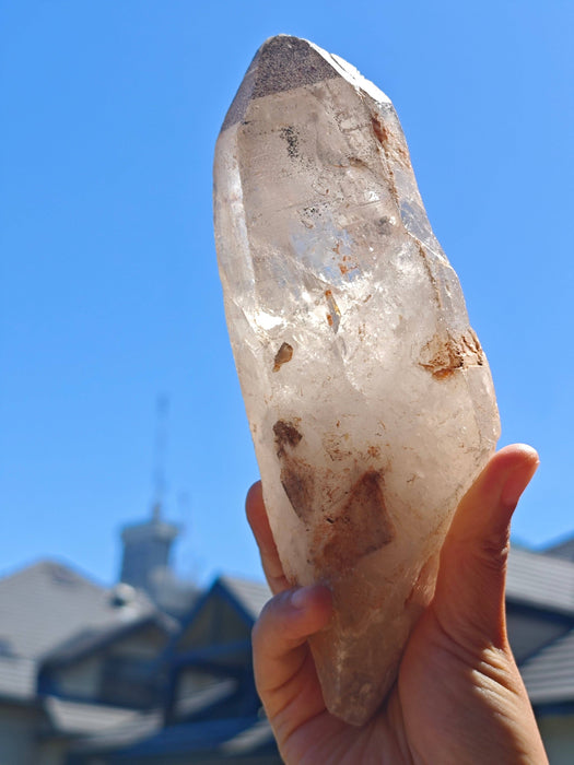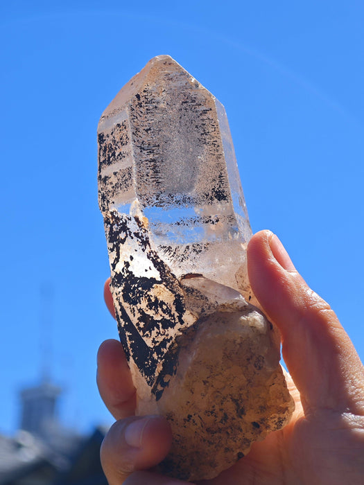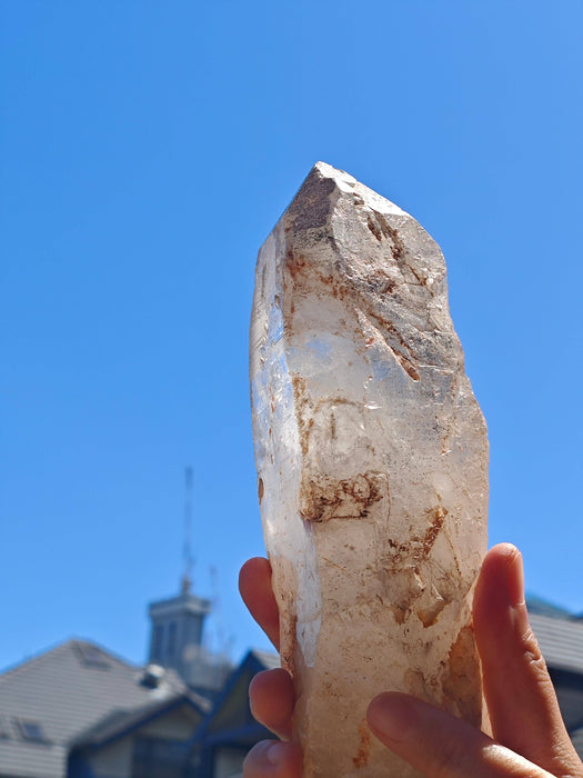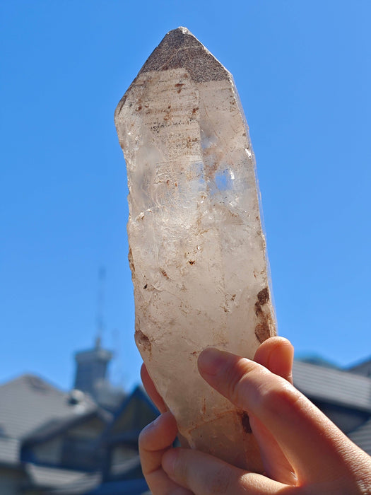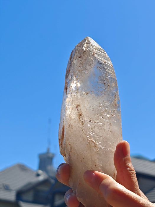 Tämä vaikuttava, raakapintainen käsittelemätön vuorikidekärki toimii voimakkaana energian vahvistajana. Kide on säilyttänyt luonnollisen kärkimuodostelmansa, mikä tekee siitä erinomaisen työkalun energian suuntaamiseen esimerkiksi meditaatiossa, kristallihoidoissa, manifestoinnissa tai feng shui -käytössä.