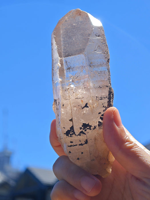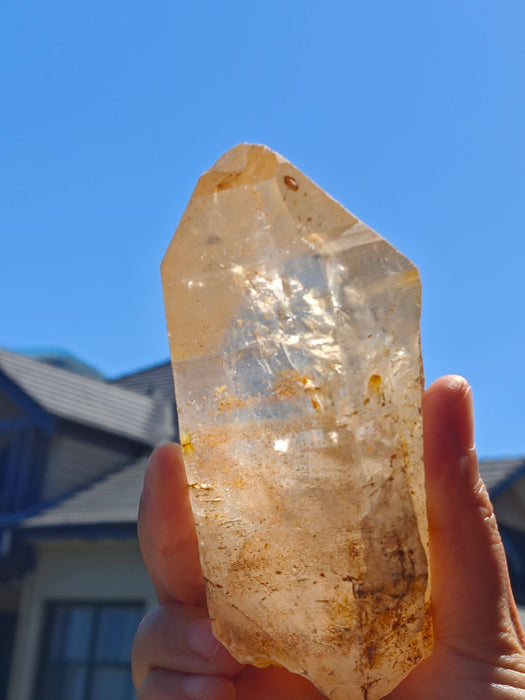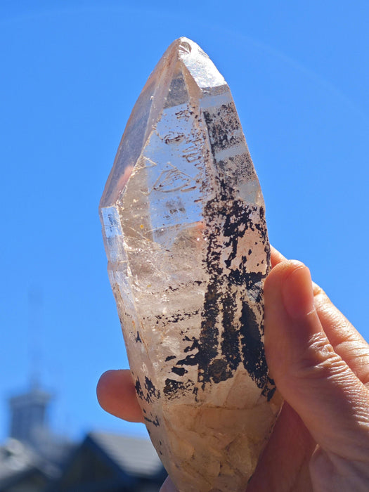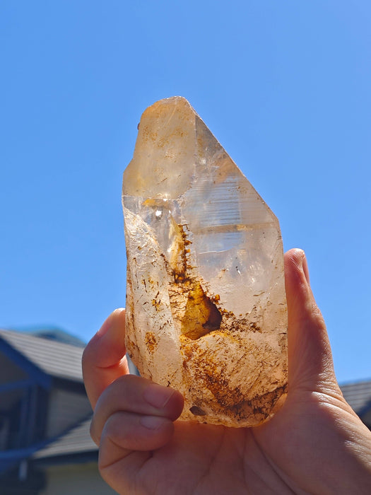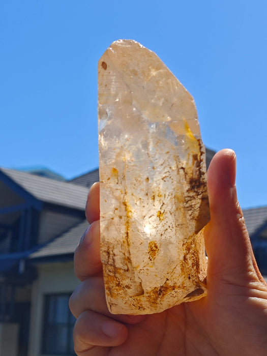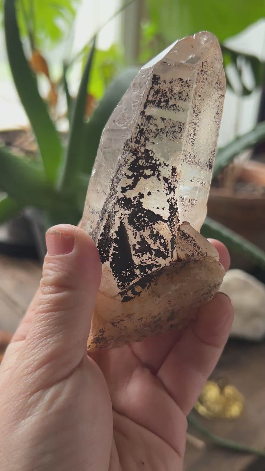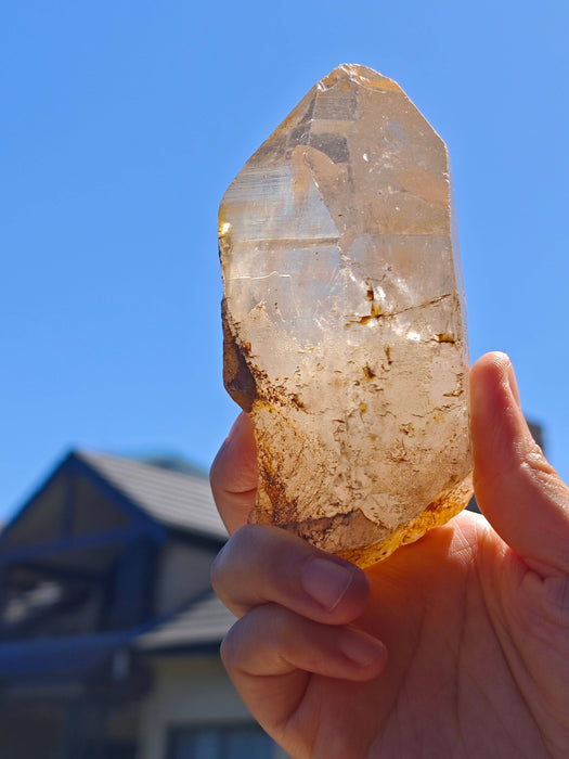Tämä vaikuttava, raakapintainen käsittelemätön vuorikidekärki toimii voimakkaana energian vahvistajana. Kide on säilyttänyt luonnollisen kärkimuodostelmansa, mikä tekee siitä erinomaisen työkalun energian suuntaamiseen esimerkiksi meditaatiossa, kristallihoidoissa, manifestoinnissa tai feng shui -käytössä.
