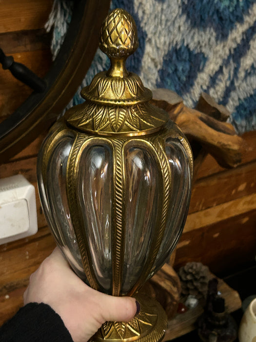 Koristeellinen messinki- ja lasimalja kannella. Tässä elegantissa maljassa yhdistyvät kauniisti muotoiltu kirkas lasi ja yksityiskohtaisesti kaiverretut messinkiosat. Irrotettava kansi ja koristeellinen jalusta viimeistelevät maljan ylellisen ilmeen.