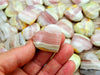 Type: Pink Banded Onyx Colors: Pink, beige, red, green, brown and yellow bands. Transparency: Opaque
