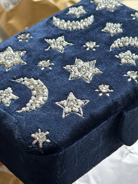 Pehmeä samettipinta ja yksityiskohtainen kirjonta tekevät rasiasta sekä käytännöllisen että kauniin säilytyspaikan pienille aarteille. Rikkaat värit ja huolitellut yksityiskohdat tuovat laatikkoon ainutlaatuista viehätystä.