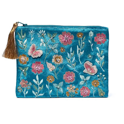 Kirjailtu samettipussi vetoketjulla n. 20x15cm