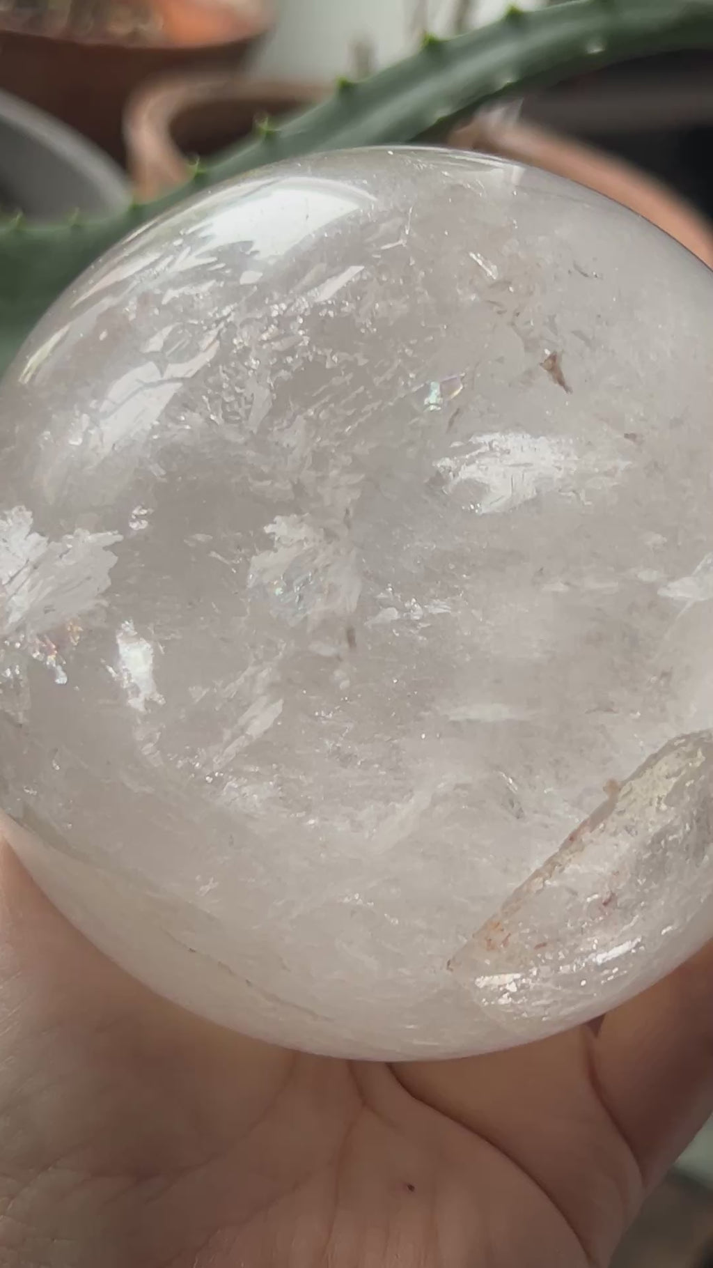 Tämä upea, kirkas vuorikristallipallo on vaikuttava lisä kristallikokoelmaan, meditaatiotilaan tai sisustukseen. Pallo on valmistettu aidosta kirkkaasta vuorikiteestä ja sen sisällä esiintyvät luonnolliset sateenkaarisulkeumat heijastavat valoa kauniisti ja lisäävät sen visuaalista viehätystä. Mukana tulee puinen jalusta esillepanoa varten.