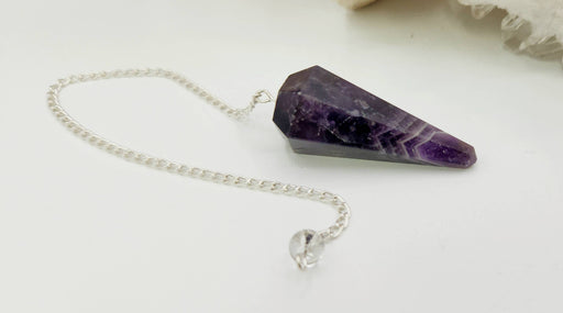Kaunis chevron-ametistista valmistettu heiluri, jossa on hopeanvärinen metalliketju ja ketjun päässä kirkas vuorikristallipallo. Heilurin pituus on...