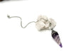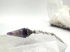 Tässä upeassa heilurissa on luonnollinen ametistikristalli, jossa kaksoispäällyste molemmissa päissä sekä hopeoitu ketju papukaijalukolla. Ametistiheiluri toimii työkaluna energian kanavointiin ja kysymysten selkiyttämiseen: heilurin liike voi vastata kyllä- tai ei-kysymyksiin.