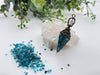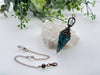 Tässä kauniisti valmistetussa heilurissa yhdistyvät luonnolliset valkoisen ja sinisen sävyiset apatiittikivisirut, kuparilanka ja kirkas hartsi. Kuparinvärinen ketju papukaijalukolla tekee heilurista sekä toimivan työkalun että uniikin korun.