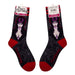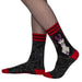 Elvira, Mistress of the Dark, nähdään näissä sukissa koko karmivan kauniissa loistossaan, klassisen femme fatalen tyyliin. Sukat on koristeltu Elviran muotokuvalla ja taustalla kietoutuvat pehmeät hämähäkinseitit. Nämä sukat suojaavat kylmiltä varpailta – ja tylsältä muodilta.